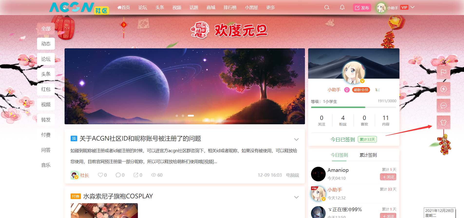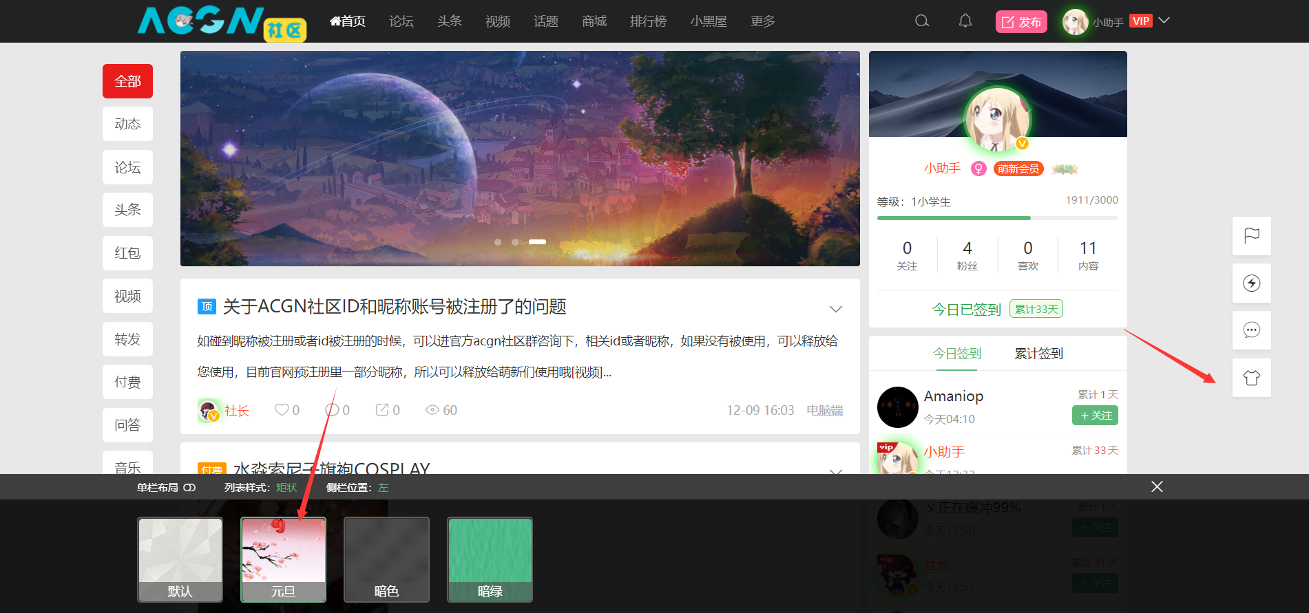 电脑端打开ACGN社区,点开右侧的个性化,选择元旦皮肤,即可变换元旦界面,赶紧快来体验吧,元旦节日,我们将在群内送一波头衔金币福利哦。