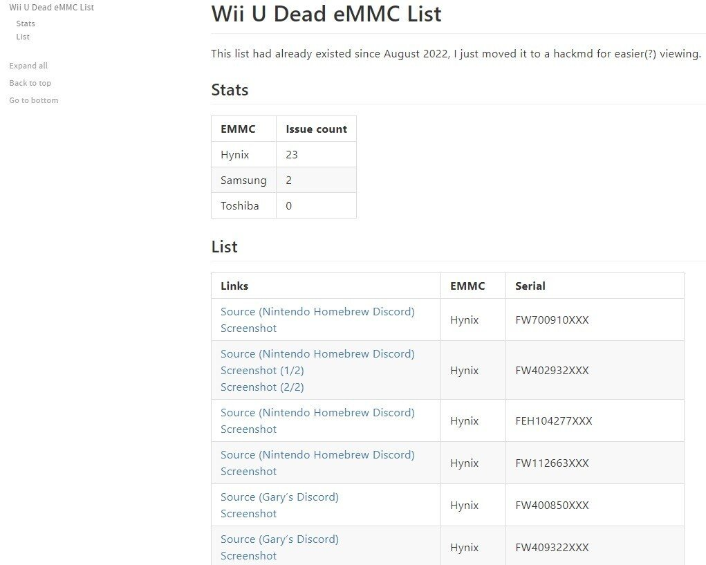 目前数据库已在hackmd.io上建立,一名成员正在从各种在线社区和来源收集Wii U所有者的硬件数据。各种迹象表明,使用了海力士eMMC的Wii U游戏机在系统故障数量方面处于领先地位,而其他配备三星型号储存的远远排在第二位,配备东芝型号的暂未发现问题。