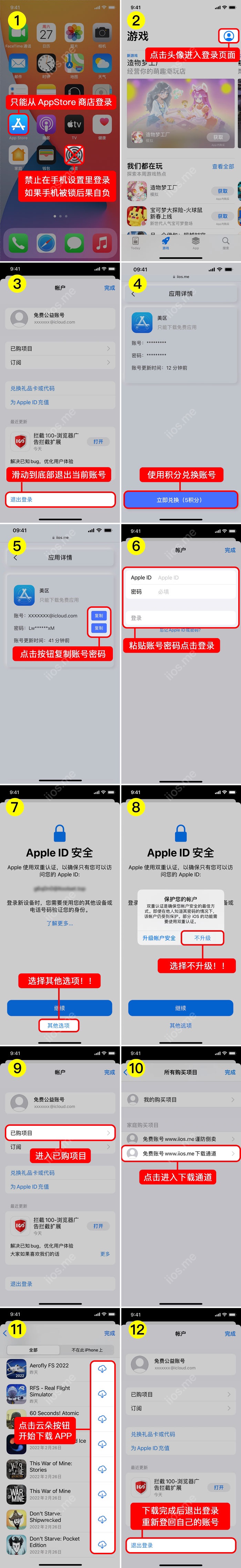 注意:请勿使用共享id登录设置里面的id登录,否则容易被锁手机,一定要从商店里面的登录,下方有图片教程,如不按照操作,出现被锁手机,请自己承担!!