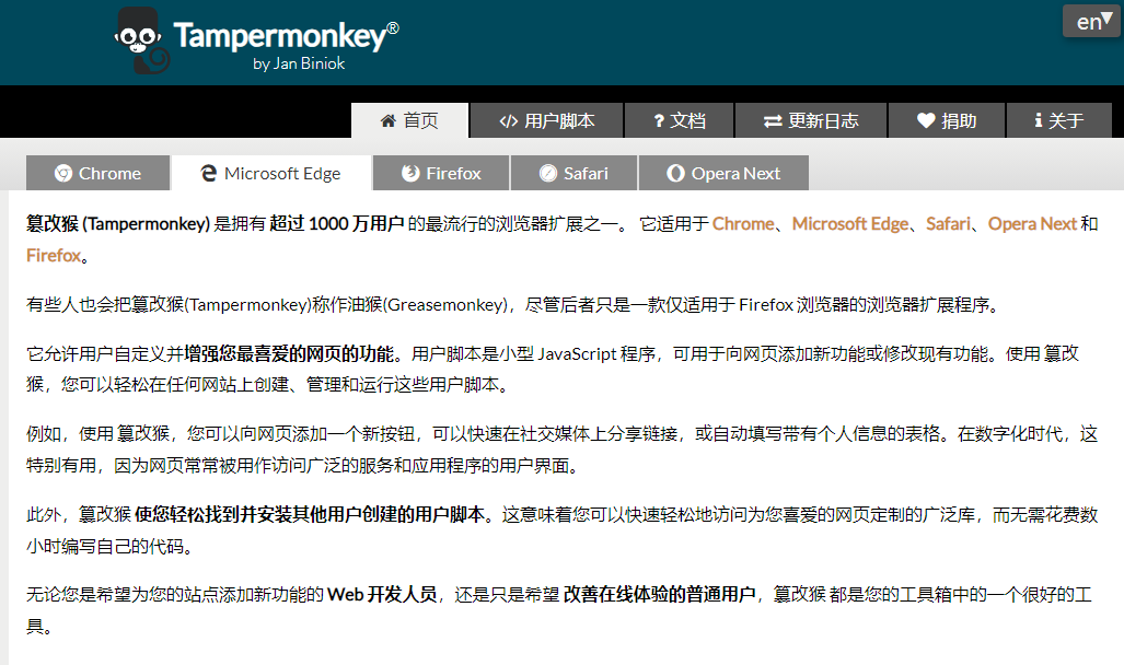 篡改猴 (Tampermonkey) 是拥有 超过 1000 万用户 的最流行的浏览器扩展之一。 它适用于 Chrome、Microsoft Edge、Safari、Opera Next 和 Firefox。