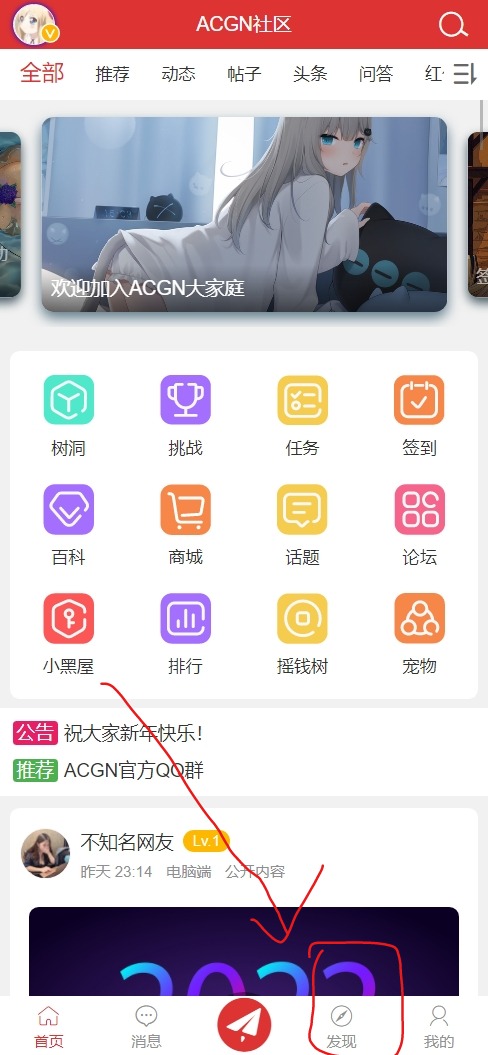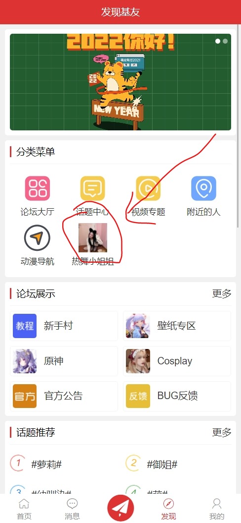 找到发现页,点进去,找到小姐姐菜单,点进去即可。